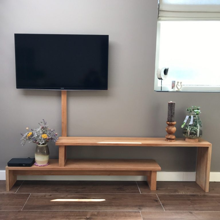 Stel dat iets eenvoudigs wil onder je TV in je stijl van je andere meubels. Dan maak ik dat gewoon. In dit geval van een bestaande tafel.
