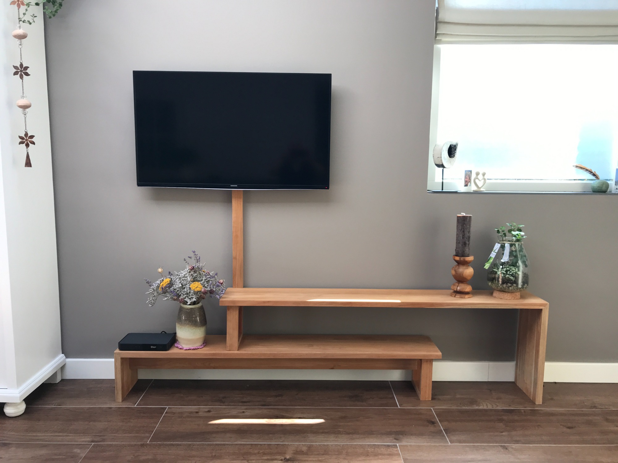 Stel dat iets eenvoudigs wil onder je TV in je stijl van je andere meubels. Dan maak ik dat gewoon. In dit geval van een bestaande tafel.